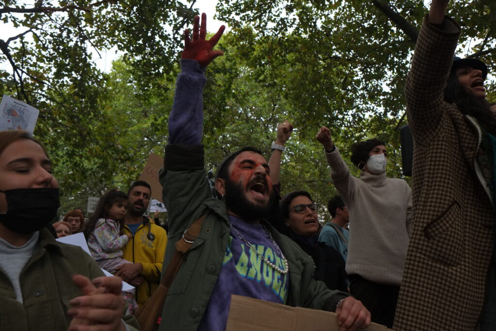Nachdem Videos von leidenschaftlichen Aktivisten*innen, unter der Internetzäsur nun endlich die Sozialen Medien erreicht haben, wollte ich mir selbst ein Bild der Proteste in Berlin machen. Vor dem Brandenburger Tor versammelten sich hunderte von Menschen der lokalen Iran-Szene. Sie hinterließen eindrucksvolle Bilder, wie sich unter anderem Frauen aus Solidarität die Haare abschnitten. Anfangs verfolgte ich diese Wut über Twitter, recht schnell breitete sich eine Protestwelle über ganz Deutschland aus. Meine Beobachtungen fingen auf dem Nettelbeckplatz an, ein Podest, eine handvoll Menschen, friedlich, dann wurden es rapide mehr, hunderte von Menschen, mit Schildern, Plakaten und blutigen Bemalungen an den Händen und Füßen.