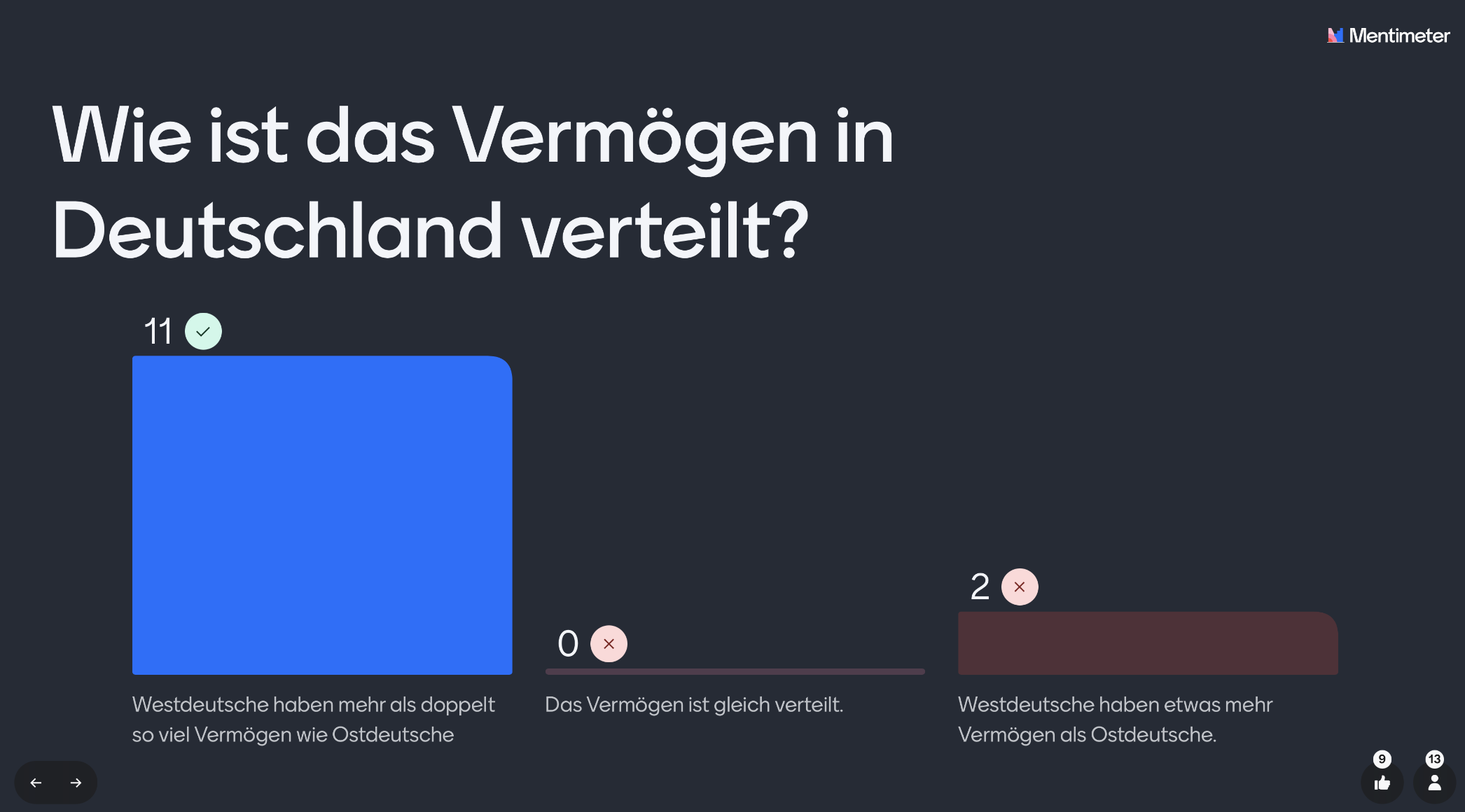 Damit leitet Anna in den zweiten Teil des Workshops ein. Es gehe um das Herunterbrechen der harten Fakten und ein einziges Mal um das Zusammenfassen der Unterschiede zwischen Ostdeutschland und Westdeutschland. So müssen nun die Teilnehmenden Fragen beantworte. Die Handys werden herausgeholt, der QR-Code eingescannt. Die erste Frage erscheint auf dem dunklem Bildschirm: