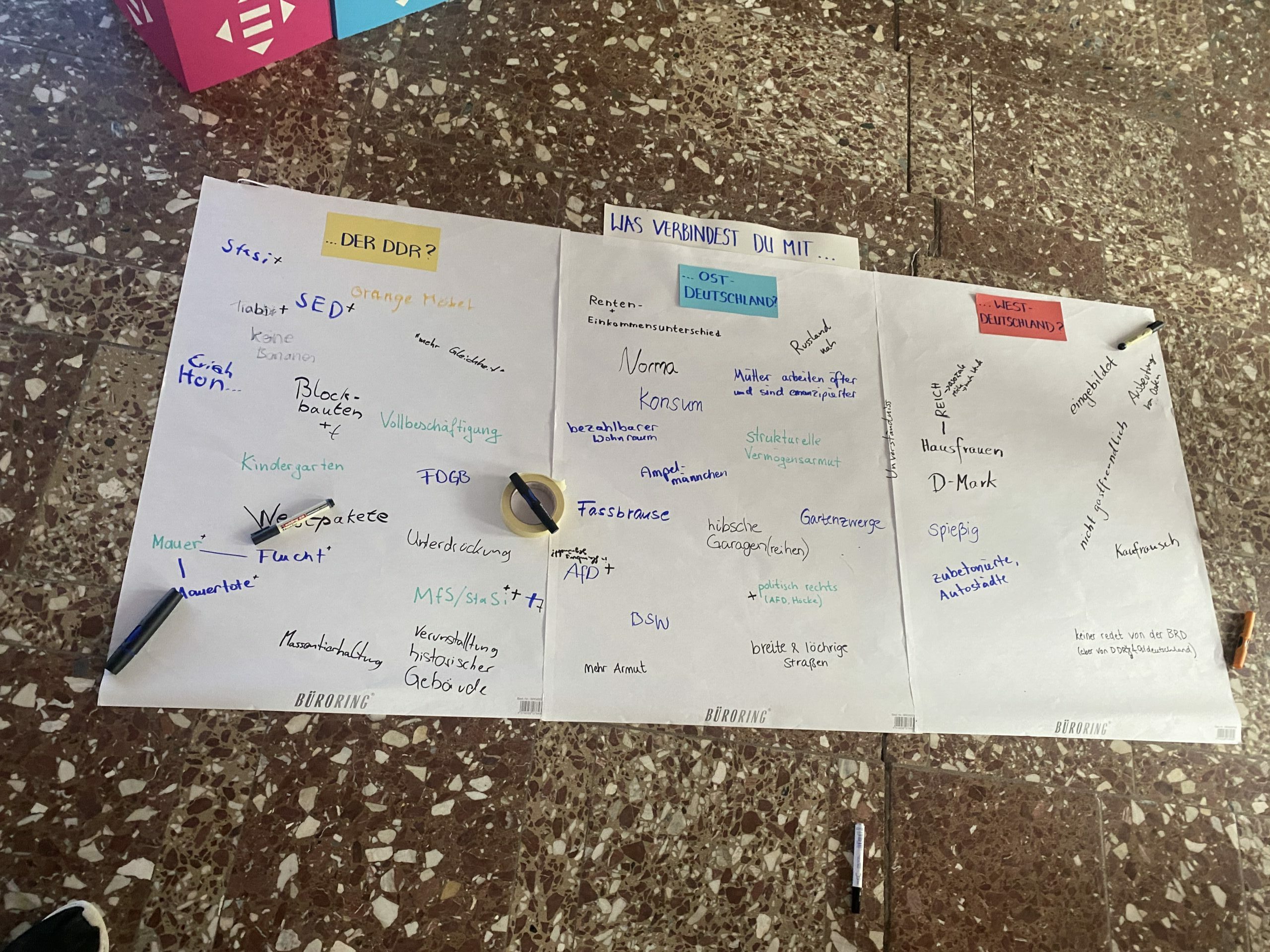 Diese Erfahrung bestätigen auch die Teilnehmenden, einige stammen selbst aus dem Osten und nicken zustimmend bei den Erzählungen von Anna. Die andere Hälfte kommt aus dem Westen, hier weichen die Eindrücke voneinander ab. „Der Osten“ wurde zwar in der Schule als Thema behandelt, aber eher die DDR und weniger die aktuellen Probleme. Irgendwie fühle ich mich in dem Moment erleichtert, ich bin also nicht die Einzige, bei der in der Lebensrealität „der Osten“ nicht immer präsent ist. Anna möchte nun wissen, was die Teilnehmenden mit der DDR, Ostdeutschland und Westdeutschland verbinden. Die Namen von Supermarktketten fallen, Spülmittel werden miteinander verglichen und immer wieder ertönt auch ein leichtes Lachen, bei einem Blick auf die notierten Eindrücke: