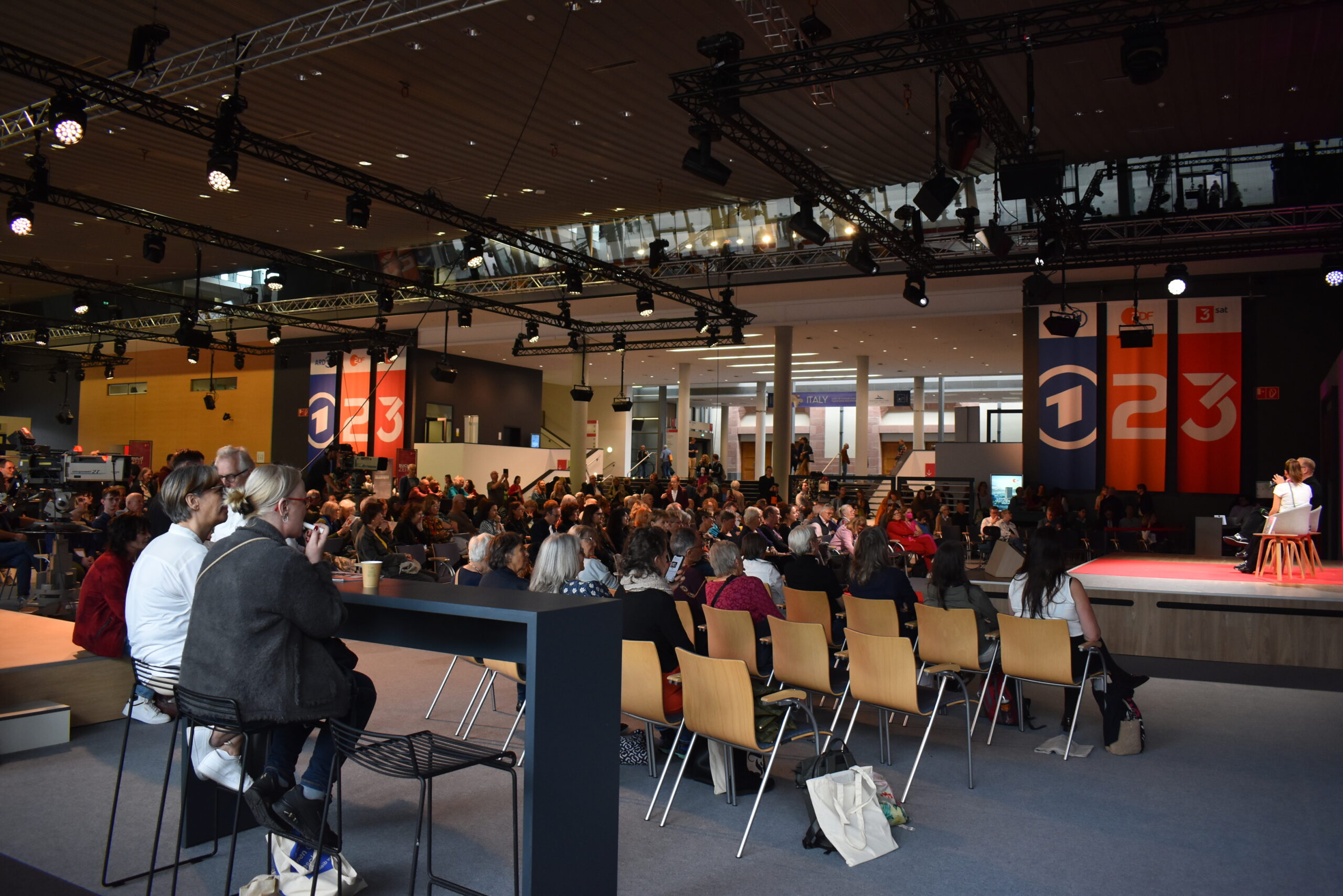 Daraufhin laufen wir ein Stück weiter auf Laufbändern einer langen Passage in die Hallen 3.0 und 3.1. Hier sind die deutschen Verlage zusammen mit Ständen von Bundesländern sowie der Hörwelten (Hörbücher). Bekannterweise macht laufen hungrig, weshalb wir uns zur Agora begeben. Dieser Platz im Zentrum der Messe enthält ein schneckenähnliches Gebäude, eine Open-Stage und zahlreichen Essenswägen. Kurzentschlossen steuern wir einen Pommes stand an. Wir vernaschen die überteuerten Pommes mit Champignonsoße, bevor wir weiter erkunden. An den Meet-the-Author-Ständen vorbei geht es dann zur Literaturbühne von ARD, ZDF und 3sat sowie zu dem zuvor genannten Ehrengast Italien.