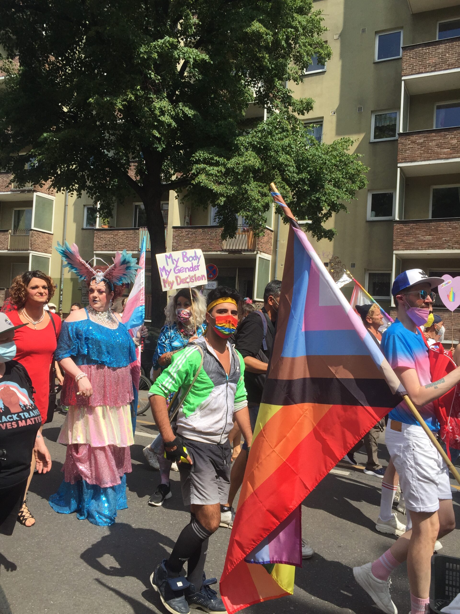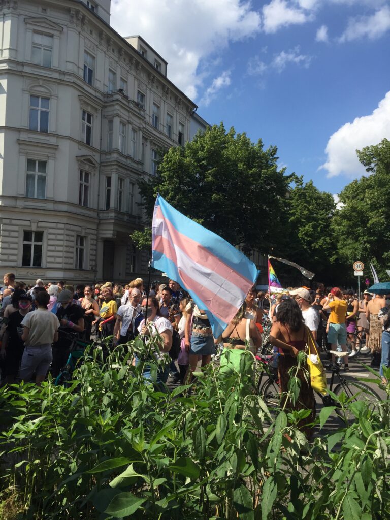 An einem sonnigen Juli-Samstag in Berlin treffen sich eine Gruppe von geschätzt 400 – 500 Menschen am U-Bahnhof Gleisdreieck, um die Existenz von trans Personen zu zelebrieren und gleichzeitig lautstark ihre Rechte einzufordern. Es ist eine bunte Masse – im wahrsten Sinne des Wortes. Personen tragen Regenbogenfarben, schwenken trans Pride Flaggen und sind extravagant geschminkt und gekleidet. Zu Beginn ist die Stimmung heiter, es wird gefeiert und Musik gespielt. Doch als die Demonstration nach eineinhalb Stunden vor dem Viktoriapark zu einem Halt kommt, damit einige Redner:innen sprechen können, wird vielen wieder klar, worum es bei dieser Veranstaltung wirklich geht. Es geht nicht darum zu feiern, sondern zu kämpfen und für die Rechte dieser marginalisierten Gruppe einzustehen.